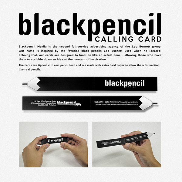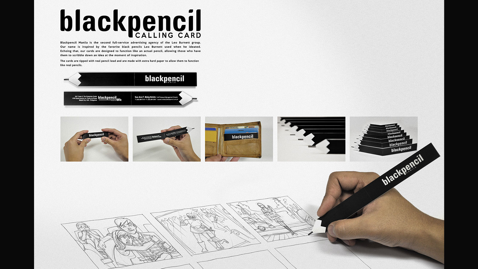 An interesting true story is that when this design idea was part of the finalists of one awards show, the organizers could not find a pencil to use to mark the panels for the finalists exhibit. So the Blackpencil rep on the awards committee ended up giving them the Blackpencil calling card to get the job done!