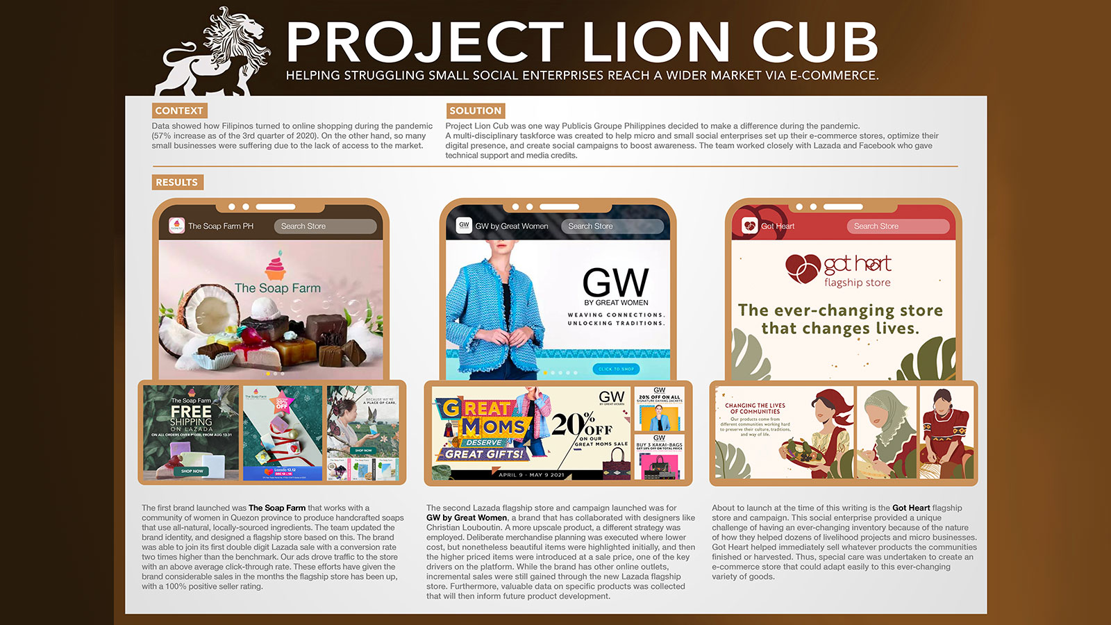 The data showed how quickly Filipinos were turning to online shopping during the pandemic, and we saw how so many small businesses were suffering due to the lack of access to the market. So we picked a number of small social enterprises and we helped set up their e-commerce stores, optimized their digital presence, and created social campaigns to boost awareness. The team worked closely with Lazada and Facebook who gave technical support and media credits.
