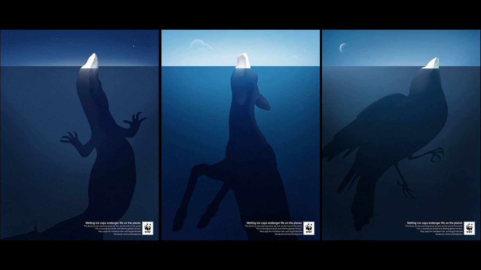 Scholarly articles and scientific research prove that environmental degradation in another part of the world is linked to climate change elsewhere far away. Like how melting Arctic ice caps cause flooding in other parts of the world. But people won’t plow through the data. We needed quick-read, high-impact communication to make the point. We created posters showing local animal life perishing due to the melting ice caps. Simple graphics, simple message. And a call for donations to WWF.
